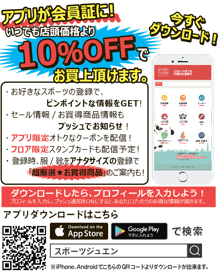 スポーツジュエン会員様に大好評の特典です。いつでも、そしてスポーツジュエンどの店舗でも10%オフ!レジにてアプリ会員証またはクラブ会員カード、提携カードを提示頂くだけで、表示価格より10%オフとさせて頂きます。