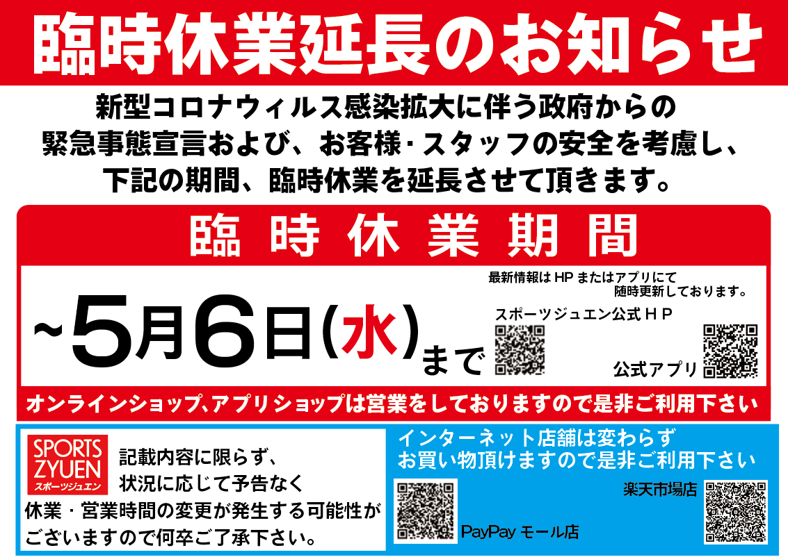 【~5月6日(水)】まで休業延長のお知らせ