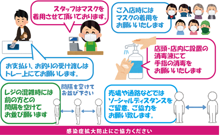 ・マスクまたは口元を覆う/入店時の手指消毒/ソーシャルディスタンスの確保など