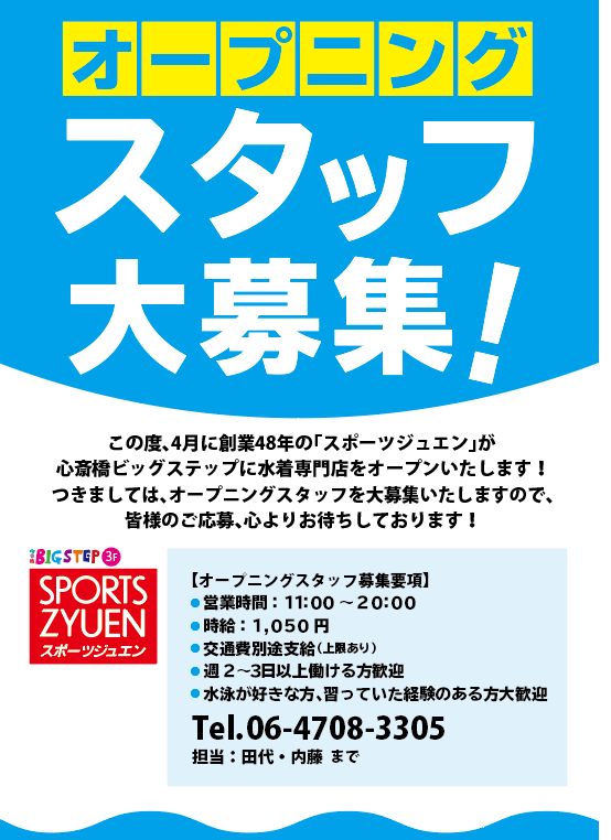 2021.04.01 【 心斎橋ビッグステップ店 オープニングスタッフ募集】 スポーツジュエン初の関西地区 大阪は心斎橋BIGSTEP内にて スイム専門店がオープン致します。 一緒に楽しく働いてくれるスタッフをまだまだ大募集しておりますので 是非お気軽にご応募下さい! ● 営業時間:11:00 ~ 20:00 ● 時給:1,050 円 ● 交通費別途支給(上限あり) ● 週 2~3日以上働ける方歓迎 ● 水泳が好きな方、習っていた経験のある方大歓迎 Tel. 06-4708-3305 担当:田代・内藤 まで トップページ ニュース一覧